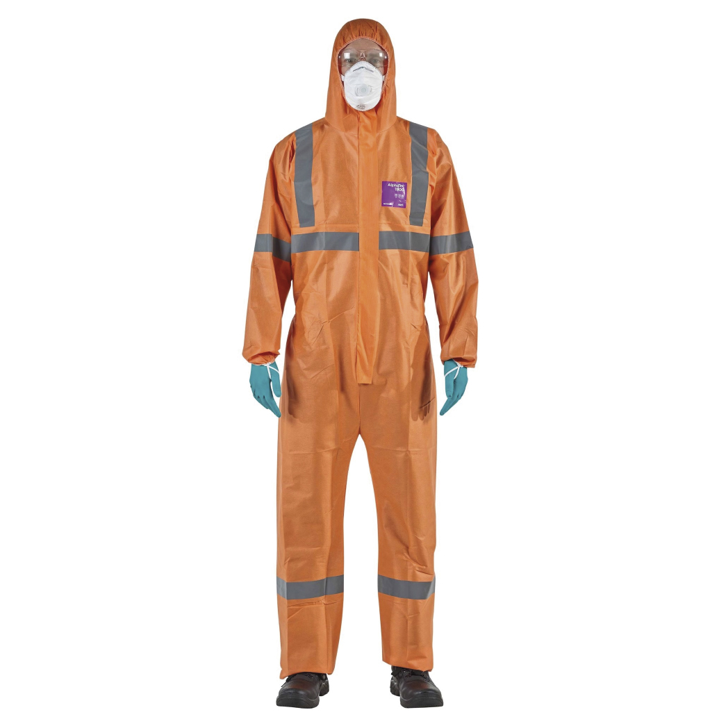 El overol desechable naranja con cintas reflectivas proporciona una buena protección frente a líquidos de bajo peligro y partículas secas.
